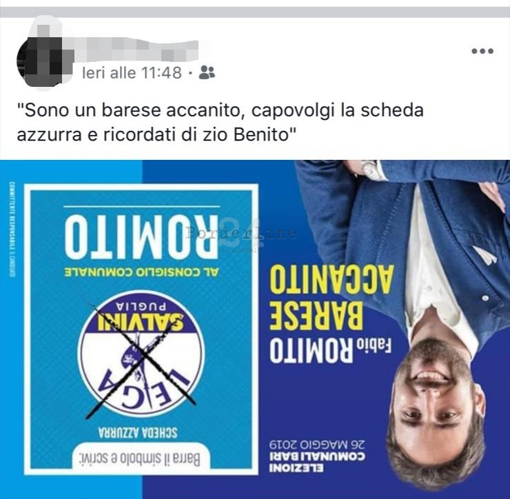 Fabio Romito, ex candidato sindaco della Lega battuto alle primarie del centrodestra da Di Rella, ha querelato una persona che su facebook gli ha “augurato” di “finire a testa in giù” come Benito Mussolini. La denuncia è stata presentata alla polizia postale che ha già svolto i primi accertamenti. “Querelo – spiega – per difendere […]