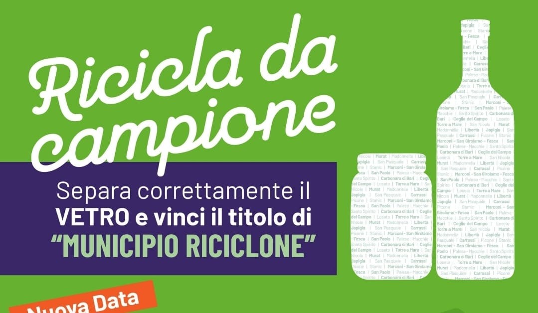 Sono in programma questo weekend gli ultimi due appuntamenti della competizione “Ricicla da campione”, la gara tra Municipi inserita nella campagna di sensibilizzazione organizzata da Comune di Bari e Amiu Puglia, in collaborazione con CoReVe – Consorzio per il riciclo del vetro e Anci, nell’ambito del Progetto territoriale Città di Bari per il miglioramento della […]