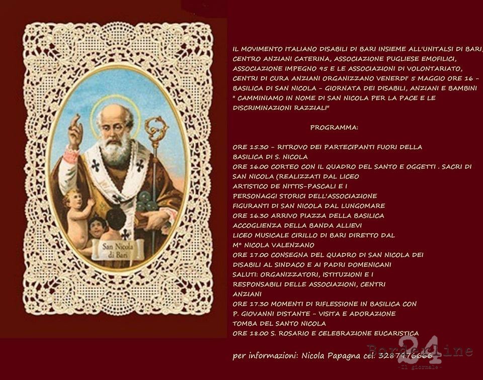 Venerdì 5 maggio 2017, alle ore 15.30, la Sagra di San Nicola sarà aperta dalla Giornata dei disabili, anziani e bambini “Camminiamo in nome di San Nicola per la Pace e le discriminazioni razziali” che si svolgerà a partire dalla Basilica di San Nicola. La giornata sarà coordinata da Nicola Papagna (Movimento Italiano Disabili di Bari), con la collaborazione […]