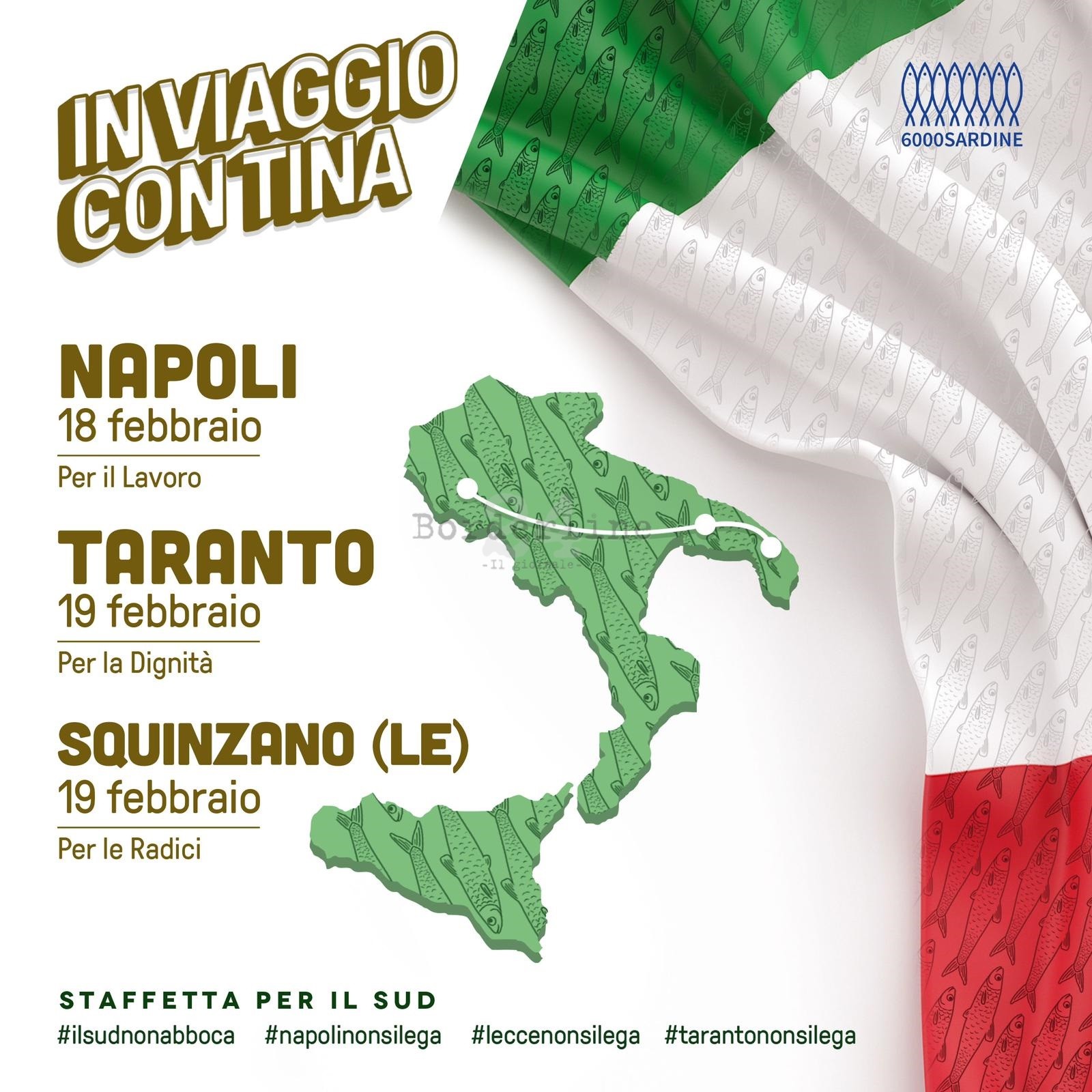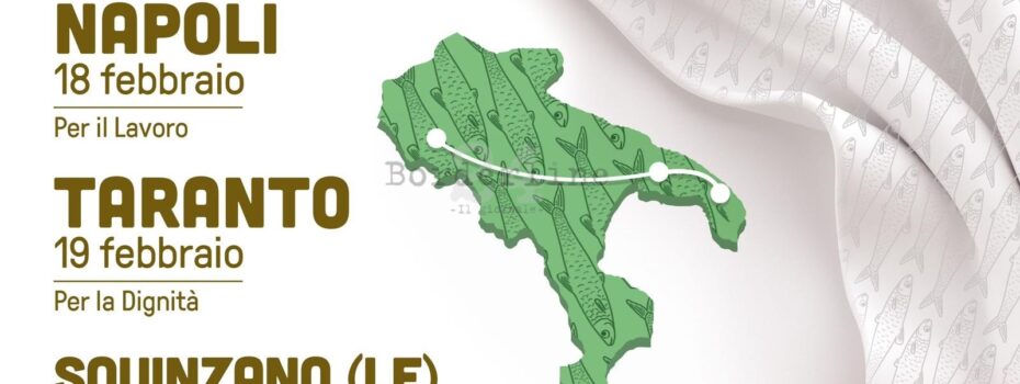 Dopo aver fatto tappa a Napoli la staffetta delle Sardine punta dritto verso la Puglia. Il primo appuntamento è a Taranto, la mattina del 19 febbraio sulla banchina della Discesa Vasto in città vecchia. Alle ore 11 arriverà Tina La Sardine Gigante, condotta per mano dalle sardine Campane, da una delegazione di Sardine Lucane e […]