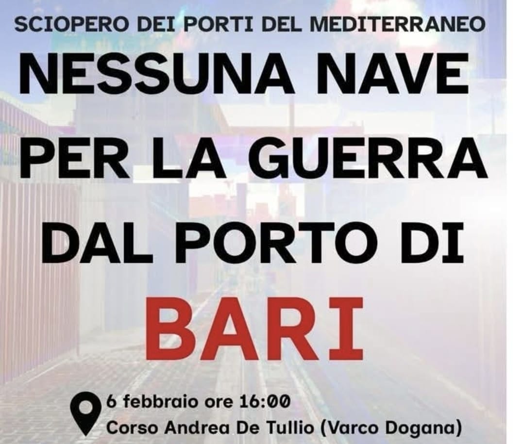 Oggi a Bari si terrà uno sciopero internazionale dei porti contro guerra, riarmo e uso delle infrastrutture civili per la logistica bellica. Il presidio si svolgerà dalle ore 16.00 al Porto di Bari, varco Dogana. Si tratta di una mobilitazione contro l’invio di armi nei contesti di guerra, contro il genocidio in Palestina, contro il […]