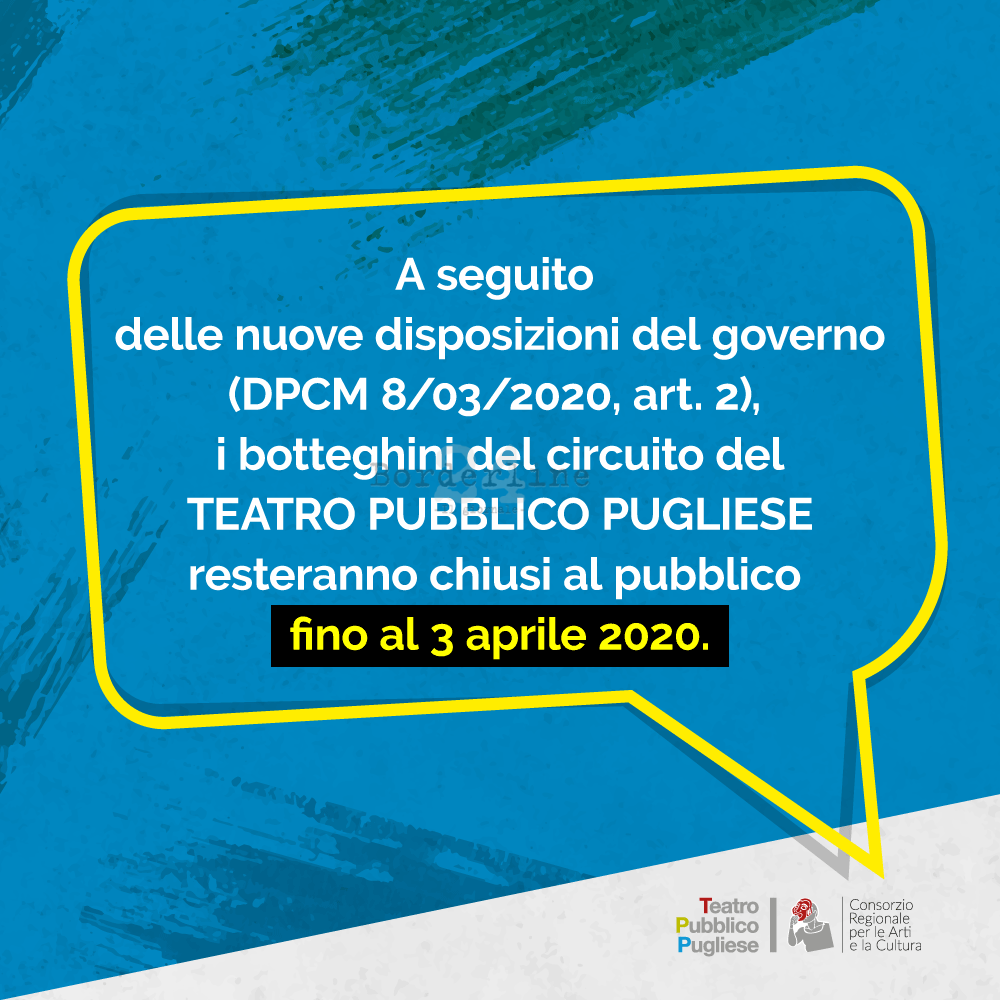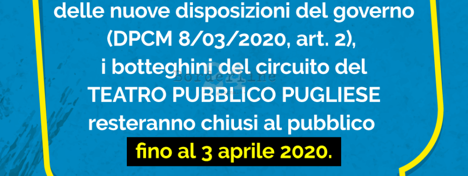 A seguito delle nuove disposizioni del Governo (DPCM 8/03/2020, art. 2), tutti i botteghini dei teatri del circuito Teatro Pubblico Pugliese resteranno chiusi al pubblico fino al 3 aprile 2020. Saranno assicurati i servizi di informazione e assistenza agli spettatori nelle seguenti modalità: – tutte le news e gli aggiornamenti in tempo reale sul sito […]