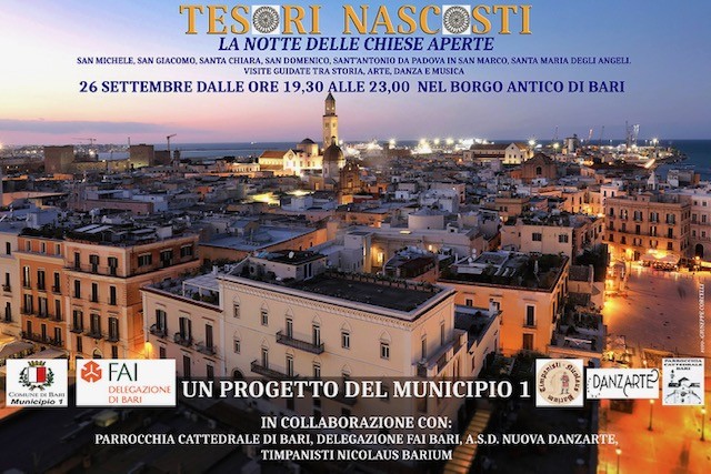 Sei chiese di Bari vecchia chiuse al pubblico saranno aperte il 26 settembre nel corso dell’evento “Notte delle chiese aperte” che svelerà la bellezza dei tesori nascosti di Bari vecchia. L’iniziativa, ideata dal Municipio I, è stata presentata a Palazzo della Città dall’assessora alle Culture Paola Romano, dalla presidente del Municipio I Annamaria Ferretti, dal […]