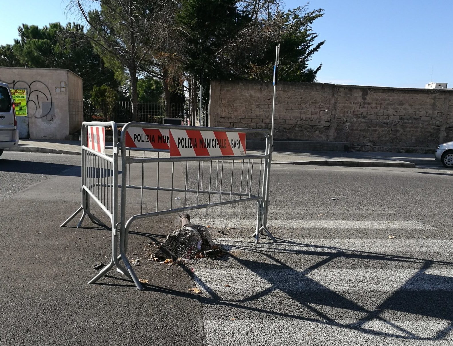 Oltre un mese fa qualcuno ha pensato bene di travolgere, probabilmente con un mezzo pesante, il paletto che impedisce il transito a pochi metri dalla rotatoria del ponte Adriatico, su via Tommaso Fiore. La zona è stata transennata, ma da allora quel paletto giace sulla strada. Ancora nessuno dell’amministrazione comunale ha provveduto al ripristino.