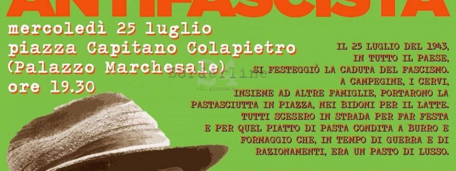 Mercoledì 25 luglio anche Turi, dalle 19.30, in piazza Colapietro, ospita un evento dedicato alla “Pastasciutta antifascista” organizzato dalla sezione locale dell’Associazione nazionale partigiani d’Italia “Amalia Marino”, e patrocinato, tra gli altri, da Aiab (Associazione italiana per l’agricoltura biologica) Puglia e Legacoop Puglia. Interverranno la partigiana e saggista Lidia Menapace, la presidente regionale di Aiab, […]