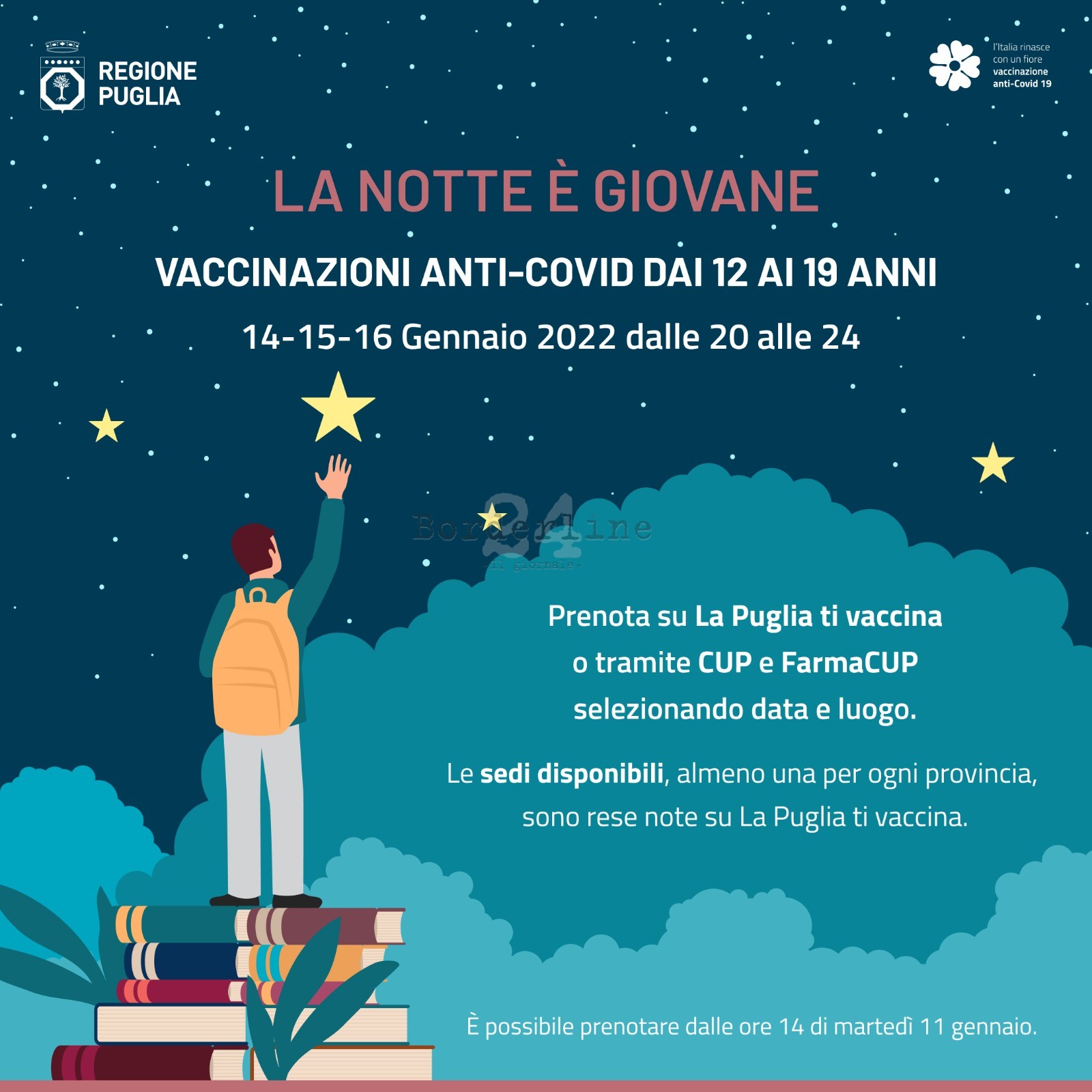 Venerdì 14, sabato 15 e domenica 16 gennaio le principali sedi vaccinali regionali, almeno una per provincia, apriranno dalle 20 a mezzanotte per sessioni di vaccinazione su prenotazione dedicate a ragazze e ragazzi dai 12 ai 19 anni. Le prenotazioni saranno attive dalle 14 di martedì 11 gennaio, sui consueti canali regionali: il portale www.lapugliativaccina.it; […]